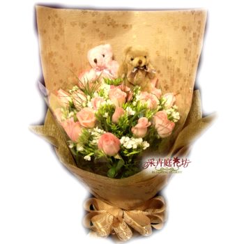 | 花材說明 : 粉玫瑰花‧葉材‧小熊2隻 |